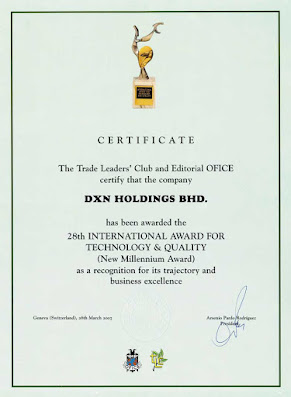 El Club de Comercio de Líderes y Editorial OFICINA certificar que DXN Explotaciones Bhd ha sido galardonado con el 28 Premio Internacional de Tecnología y Calidad (New Millennium Award) por su trayectoria y excelencia empresarial.